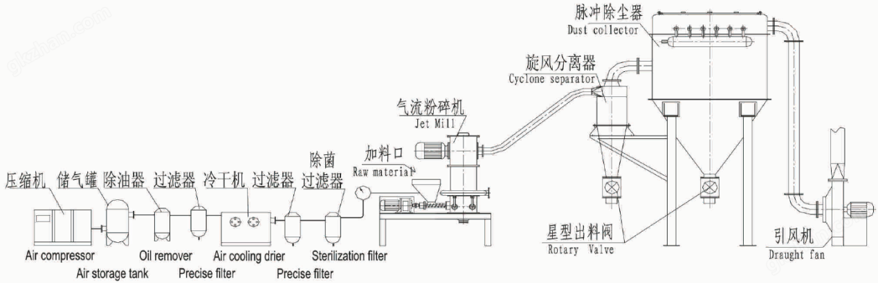 2、無污染,因為物料在氣流的帶動下密閉自身碰撞粉碎,不帶人介質,且可以通過對設備特殊處理,使物料粉碎過程中不會構成污染。