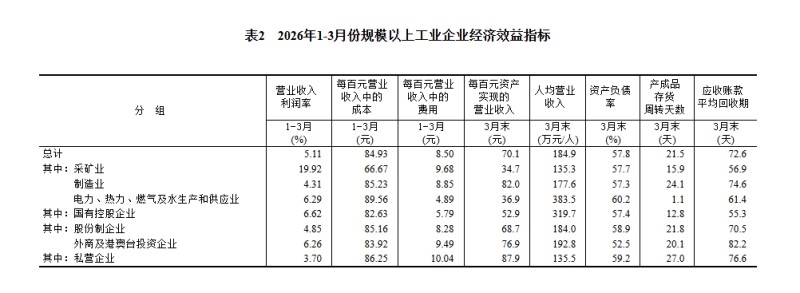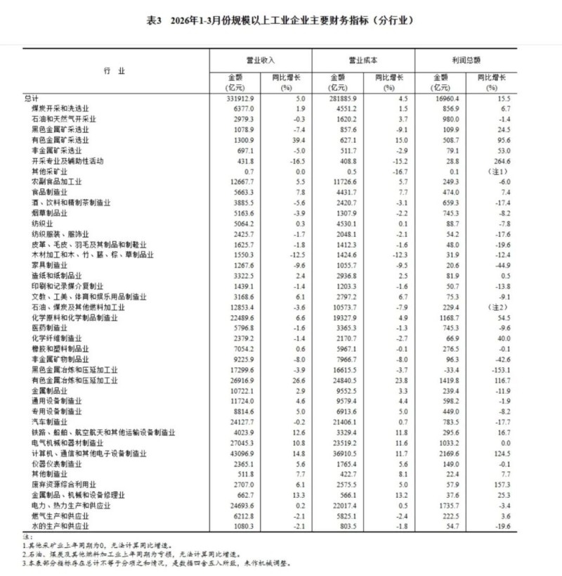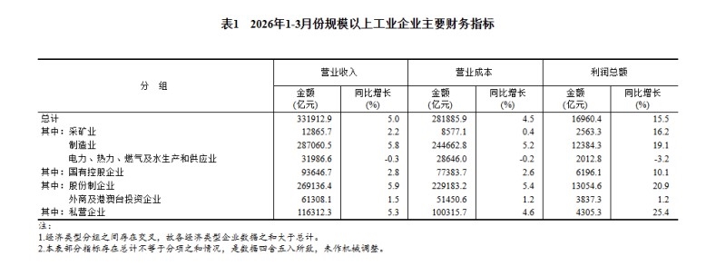 【數據發布】2026年1—3月份全國規模以上工業企業利潤增長15.5%