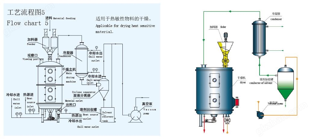 2、密閉型:配備溶劑回收裝置,可方便地回收載濕氣體中的有機溶劑。溶劑回收裝置簡單,回收率高,對于易燃、易爆、有毒和易氧化的物料,可用氮氣作為載濕氣體進行閉路循環,使之安全操作。特別適用于易燃、易爆、有毒物料的干燥。