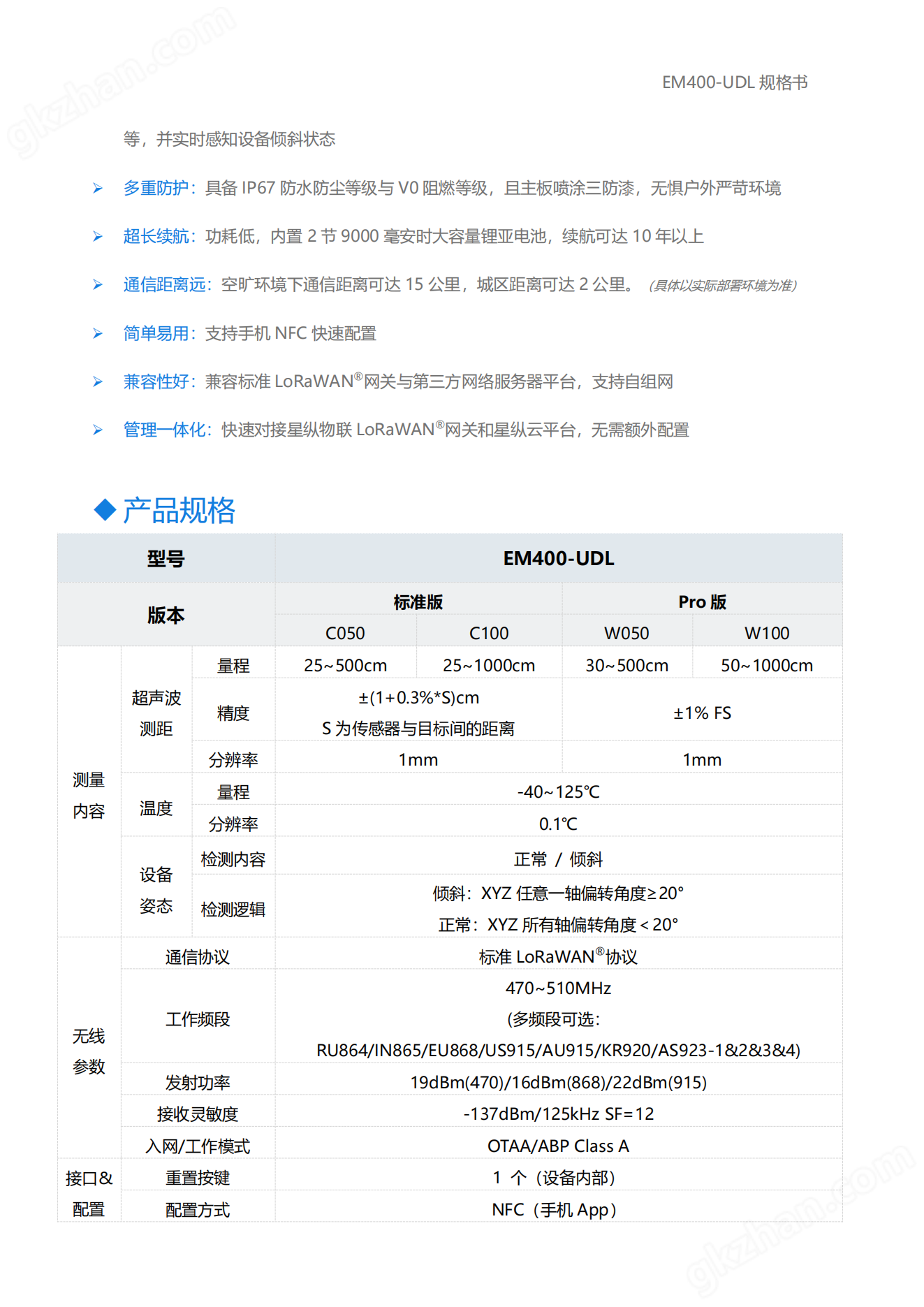 星縱物聯 EM400-UDL 是一款功能強大的超聲波測距 傳感器,產品采用高精度探頭,基于超聲波測距原理,以非 接觸方式精準測量傳感器與目標間的距離。同時產品內置溫 度傳感器和 MEMS 三軸加速度計,在測距的同時可監測設 備異常高溫/垃圾燃燒告警等,并實時感知設備傾斜狀態。 EM400-UDL 基于 LoRa®通信技術,支持 LoRaWAN ® 協議組網通信,具有通信距離遠、低功耗等特點。此外,產 品內置大容量鋰亞電池,續航可達 10 年以上。同時支持與 星縱物聯 LoRaWAN ®網關及星縱云平臺結合,實現遠程數 據監控與管理。